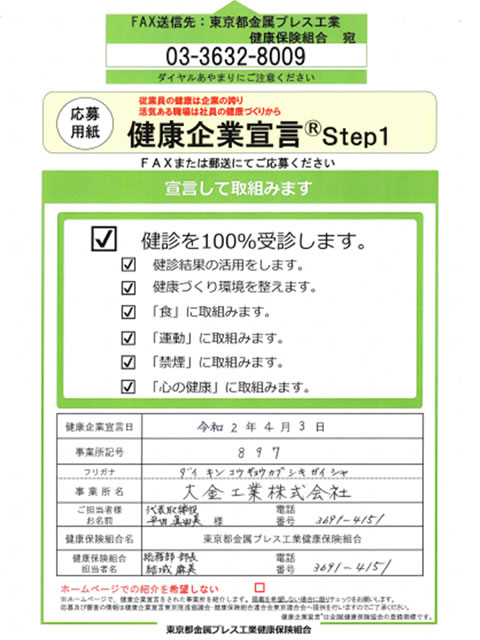 大金工業は社員の健康保持・増進に取りくみ健康経営優良法人を目指しています。その一環として健保事業「健康企業宣言」に参加中。社員が健康で活力が向上すれば、能率よく仕事に取りくむことができ、組織の価値向上にも繋がります。