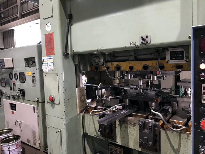 単発プレス形式は各工程が独立した形となっており、単独でプレス機器を使用します。少量生産や大型の加工品が得意です。